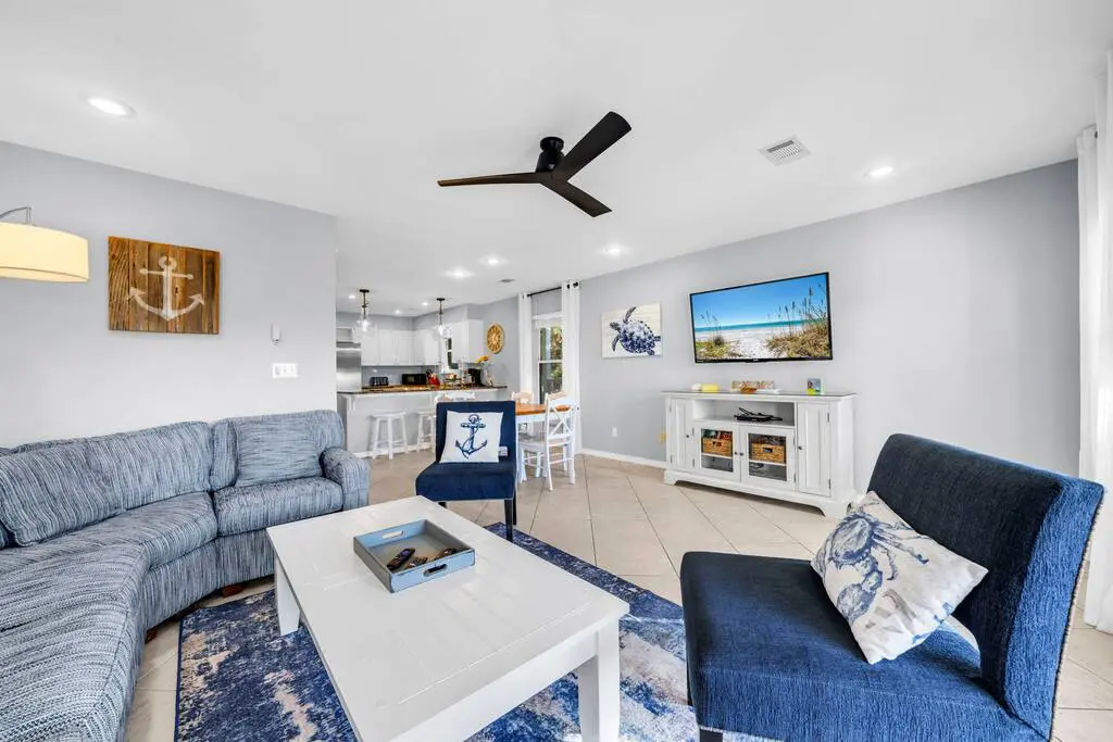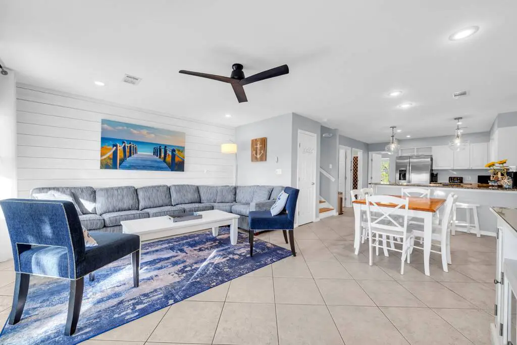 – Open-concept living and dining area with bright, coastal décor