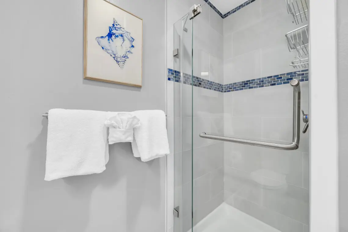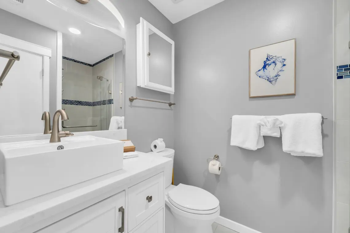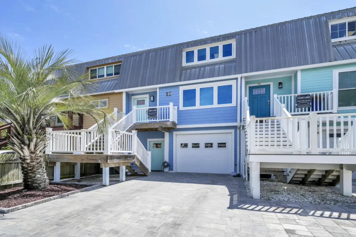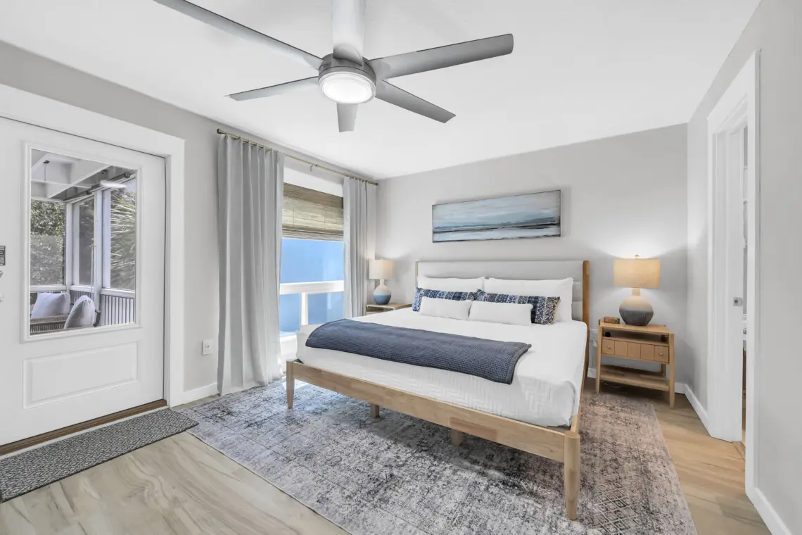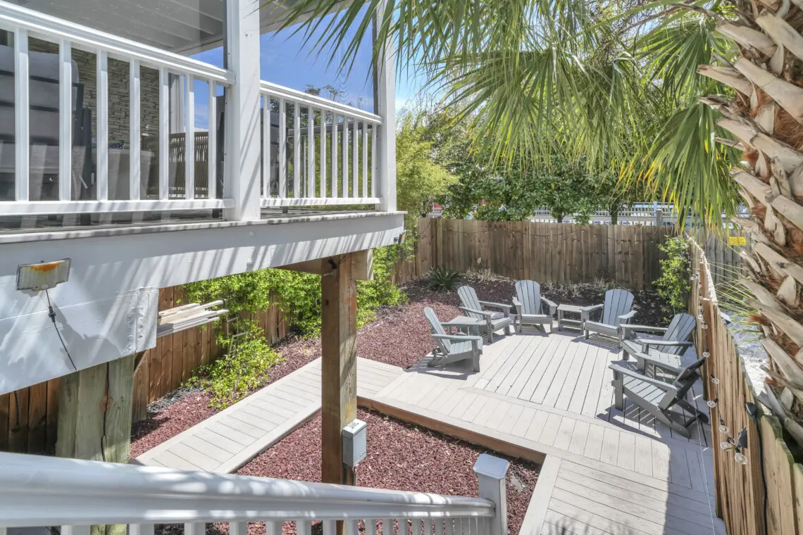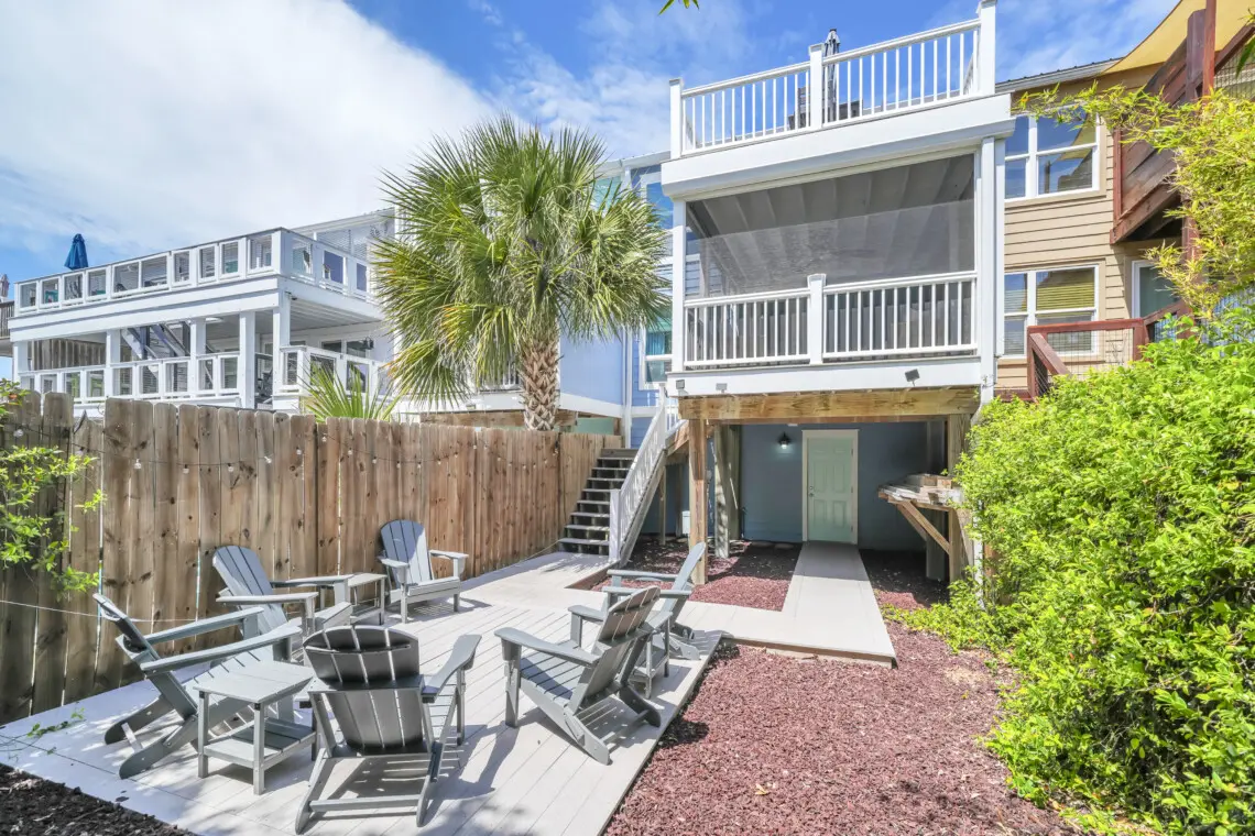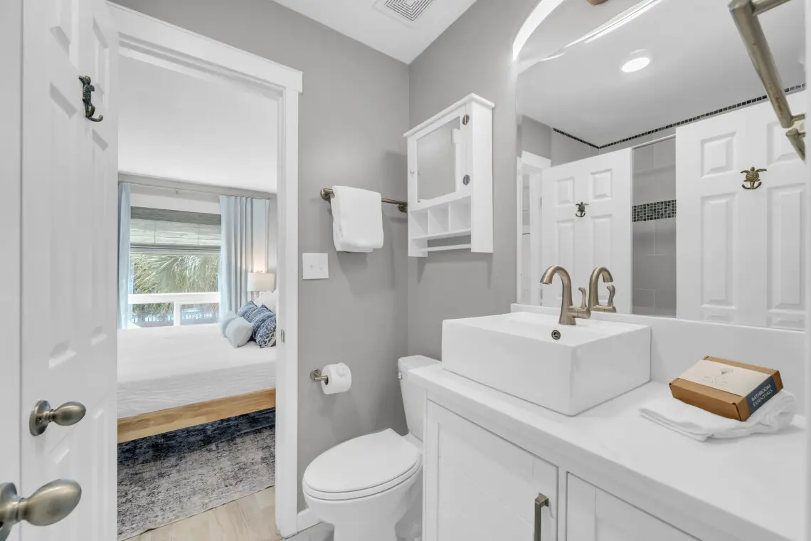 The second floor features both bedrooms connected by a Jack and Jill bathroom, creating a functional and private setup for families or small groups. The king suite opens to a private covered deck, perfect for morning coffee or winding down after a beach day.