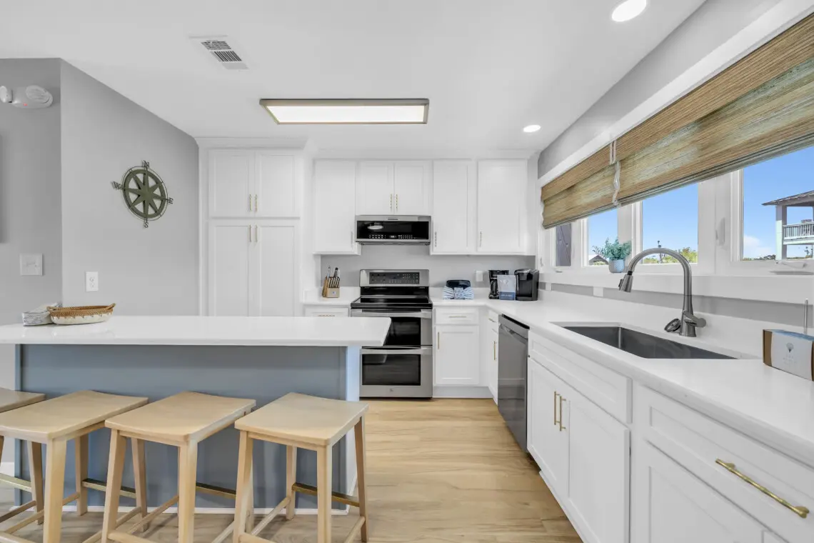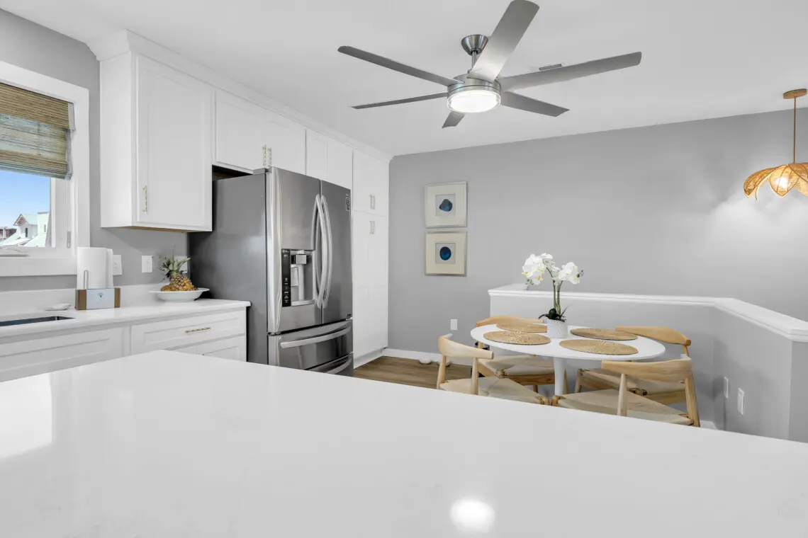 Upstairs, the main living space is bright and inviting with an open layout that flows seamlessly from the kitchen to dining and living areas. Step outside onto the upper deck for breezy outdoor dining or a relaxed evening after the beach.