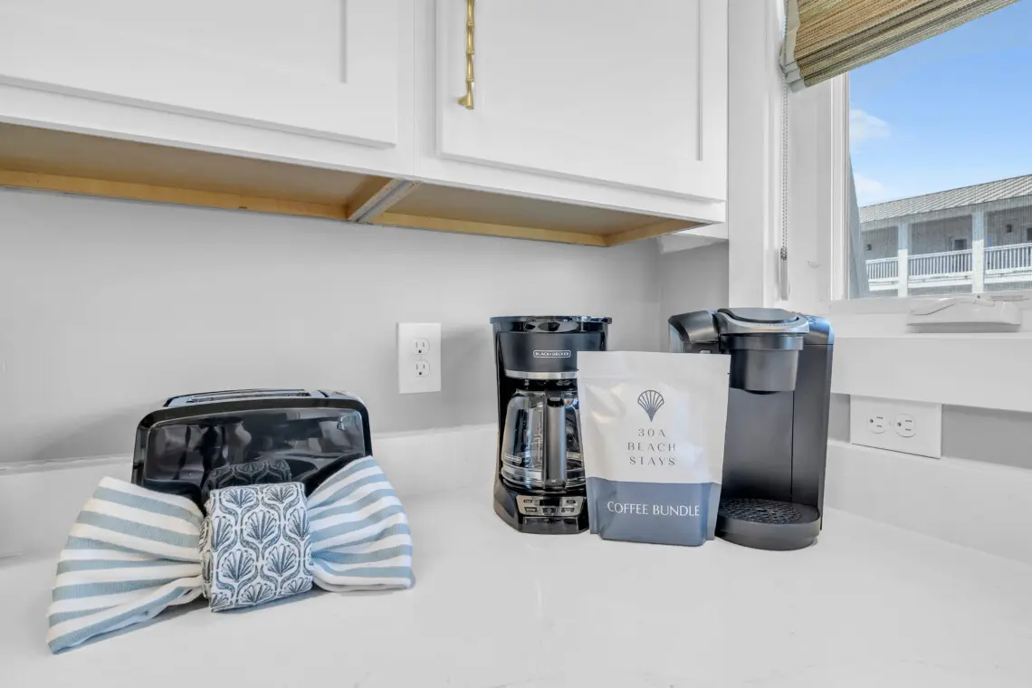 ☼ Kitchen: 2 dishwasher pods, 2 laundry pods, 1 sponge, small dish soap, 1 roll of paper towels, 30A Beach Stays Coffee kit with K-cups & Coffee grounds